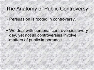 This document discusses persuasive speaking in a democratic society. It explains that persuasion is rooted in controversy and involves questions of fact, value, and policy. It also outlines the concepts of ethos, pathos, and logos in persuasive appeals. Ethos refers to the speaker's credibility, pathos to emotional appeals, and logos to the use of evidence. The document provides tips for strengthening ethos, such as sharing experiences with the audience, citing experts, and considering different viewpoints. It also notes the importance of appealing to audience emotions through techniques like affective language and vivid details.