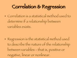 Correlation and regression analysis are statistical methods used to determine if a relationship exists between variables and describe the nature of that relationship. A scatter plot graphs the independent and dependent variables and allows visualization of any trends in the data. The correlation coefficient measures the strength and direction of the linear relationship between variables, ranging from -1 to 1. Regression finds the linear "best fit" line that minimizes the residuals and can be used to predict dependent variable values.