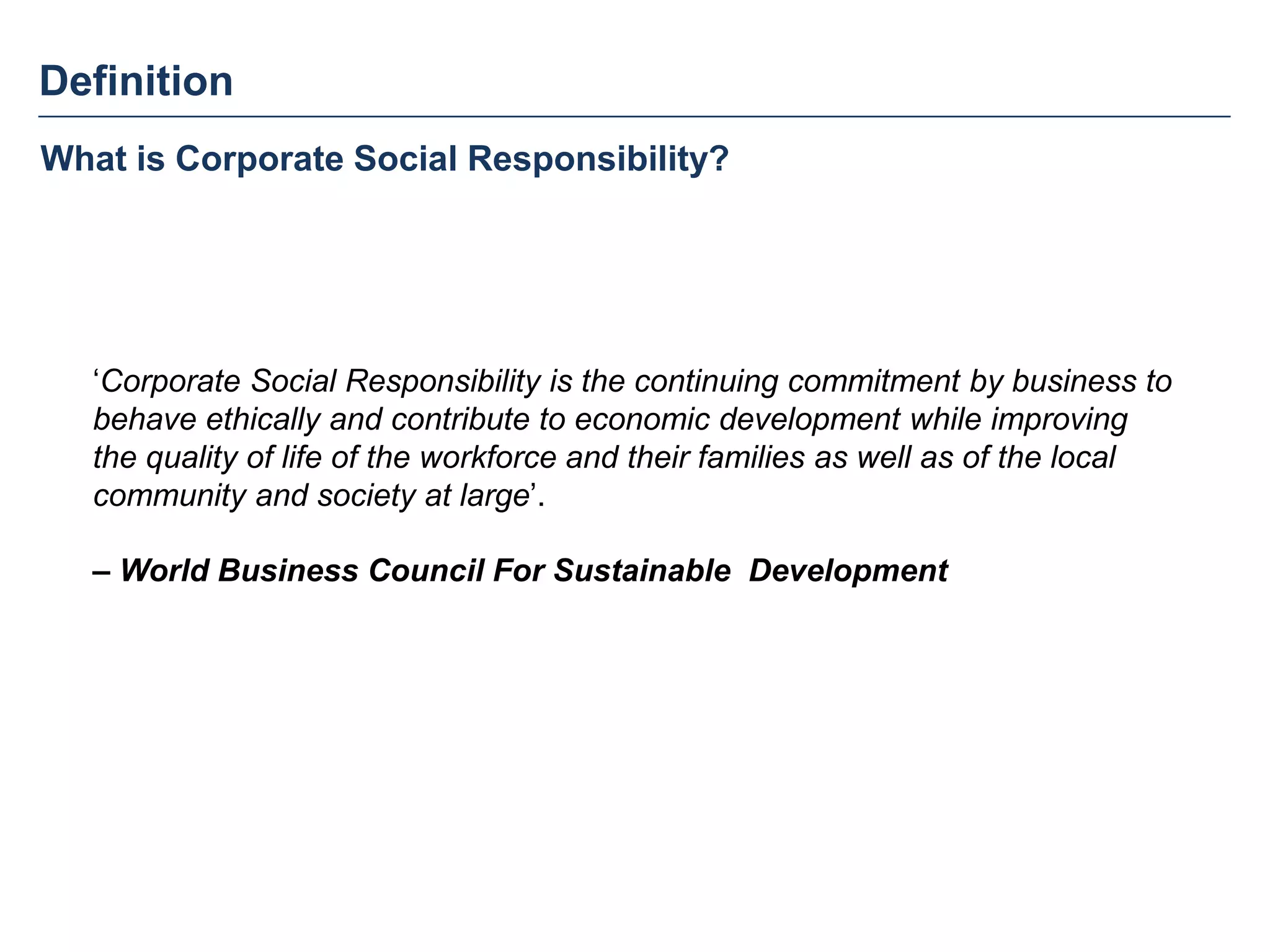 Corporate social responsibility (CSR) refers to businesses operating in an ethical manner and contributing to economic development while improving life for employees, families, local communities, and society. CSR involves businesses behaving responsibly towards all stakeholders in a globalized world. It benefits companies through increased brand value, risk management, and stakeholder trust. CSR emerged as companies grew more powerful and could help improve living standards. Gandhi advocated for ethical business practices through principles like honesty, trusteeship of wealth for social good, and serving communities rather than just profits.