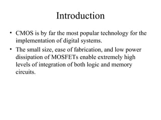 This document discusses CMOS logic circuits. It begins by explaining that CMOS is the dominant technology for digital circuits due to its low power dissipation. It then discusses the structure and operation of the basic CMOS inverter circuit. Key points include that CMOS circuits use complementary NMOS and PMOS transistors to switch the output between power and ground with very low static power. The document also discusses parameters for characterizing logic circuits like propagation delay and noise margins. It describes how to synthesize more complex CMOS gates from their Boolean expressions by constructing pull-down and pull-up networks. Specific gates like NOR, NAND, and XOR are analyzed. Transistor sizing is also covered to ensure adequate driving capability.