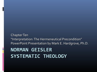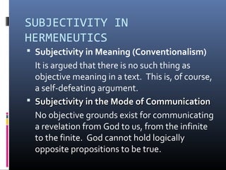 This document discusses Martin Heidegger's existential hermeneutic and how it leads to subjective interpretation. It examines Heidegger's emphasis on history, the darkening of the world, Greek philosophy, and the role of poetry and language. The presentation evaluates Heidegger's hermeneutic, finding it involves unfounded assumptions and is self-defeating. It also discusses Rudolf Bultmann's attempt to "demythologize" biblical texts by eliminating miracles, but finds this view is without foundation and unbiblical. Finally, it argues for the possibility of objective interpretation based on the existence of an absolute mind (God), absolute meaning, and humanity's ability to understand divine