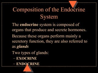 The endocrine system is composed of glands that secrete hormones directly into the bloodstream to regulate distant target organs and tissues. The major endocrine glands include the pituitary, thyroid, parathyroid, adrenal, pancreas, gonads, pineal, and thymus glands. The pituitary gland is located in the brain and regulates other endocrine glands through the hormones it secretes. Other important glands are the thyroid gland in the neck, which regulates metabolism, and the adrenal glands atop the kidneys, which secrete hormones involved in stress response. Together, hormones maintain homeostasis by influencing growth, development, metabolism, and other bodily functions.