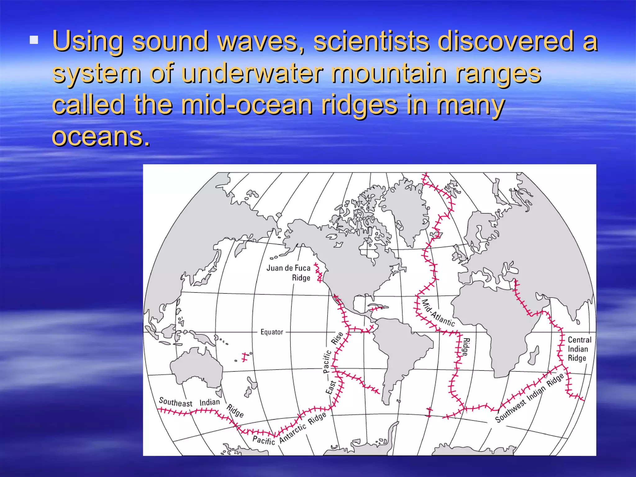 1) Scientists discovered underwater mountain ranges called mid-ocean ridges using sound waves, and Harry Hess proposed the theory of seafloor spreading to explain them.