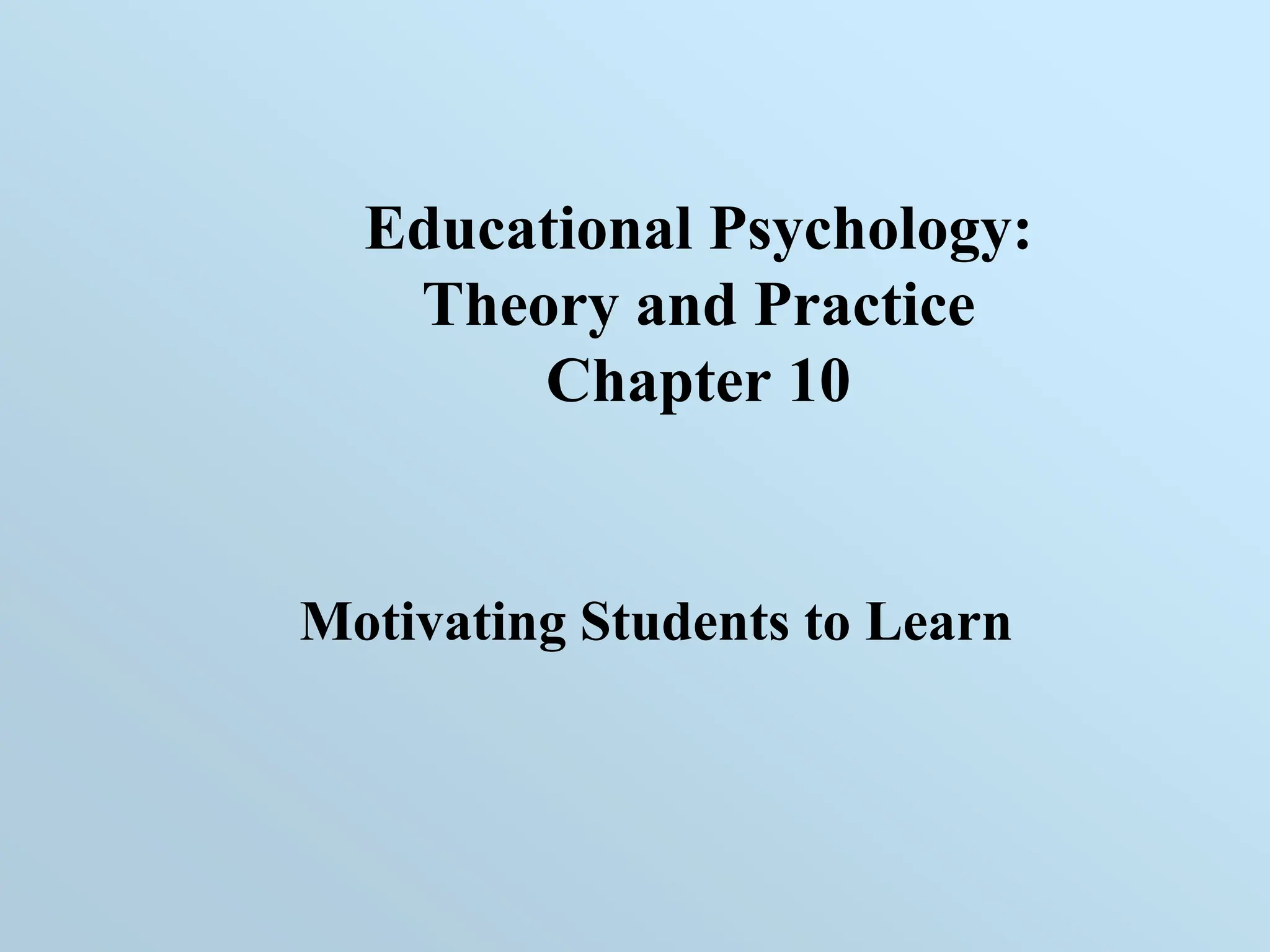 This chapter discusses theories of motivation and how to apply them in classroom settings. It covers Maslow's hierarchy of needs, attribution theory, expectancy theory, goal orientation theory and more. The key implications for teachers are to give students feedback that builds self-efficacy, set appropriately challenging tasks, emphasize learning over performance goals, and use praise strategically to reinforce effort rather than ability. Fostering an environment where students feel capable and supported can enhance their motivation to learn.