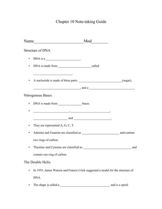 The document provides information on the structure and function of DNA and the process of protein synthesis. It discusses how DNA is made up of nucleotides containing nitrogenous bases, sugars, and phosphates. It also describes the double helix structure of DNA and how base pairing allows for DNA replication. The process of transcription is explained, where DNA is copied into mRNA which is then translated by ribosomes to synthesize proteins according to the genetic code. Mutations can potentially cause errors in protein synthesis leading to diseases.