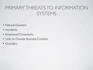 This document outlines several primary threats to information systems including natural disasters, accidents, employees, outside business contacts, and outsiders. It discusses computer crime in terms of definition and estimated worldwide losses in 2006. It also covers federal and state computer crime laws and questions their effectiveness. Additionally, it examines hackers, unauthorized access through misuse of company computers and theft of personal information. Finally, it lists several types of malware that pose threats such as viruses, worms, Trojan horses, logic bombs, spyware, and spam.