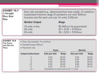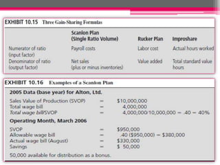 This document discusses different types of variable pay plans and incentive plans. It provides examples of individual incentive plans like merit pay, lump-sum bonuses, and spot awards. It also discusses group incentive plans like gain-sharing plans, which link pay to productivity savings, and profit-sharing plans, which link pay to financial measures. Both individual and group plans have advantages like raising productivity, but also disadvantages like increased conflict or reduced information sharing. The document provides details on the design and implementation of various incentive plan models.