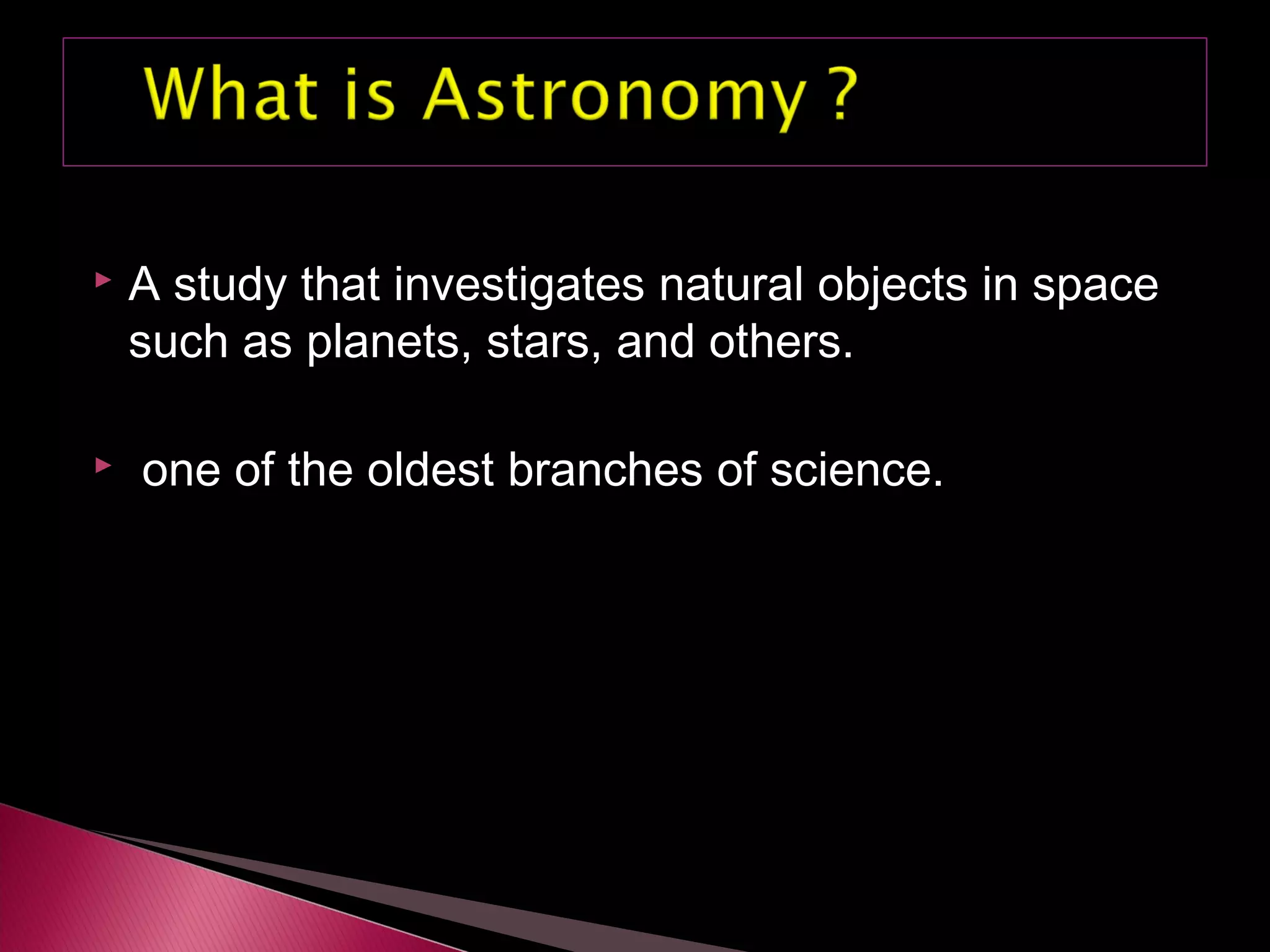 This document discusses the history of astronomy from ancient times through the 16th century. It describes how early astronomers believed the Earth was the center of the universe, until Copernicus suggested in the 16th century that the Sun is at the center. It also outlines key contributions from astronomers like Galileo and Newton that moved models toward the heliocentric view accepted today.