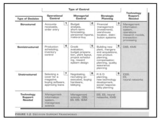 The document discusses various types of information systems that support decision making. It describes management information systems that provide routine operational reports, decision support systems that help with semi-structured tactical decisions through modeling and analysis, and executive information systems that provide customized insights to top executives. The document also covers data warehousing, data mining, expert systems, and emerging trends like personalized decision support and what-if scenario analysis.