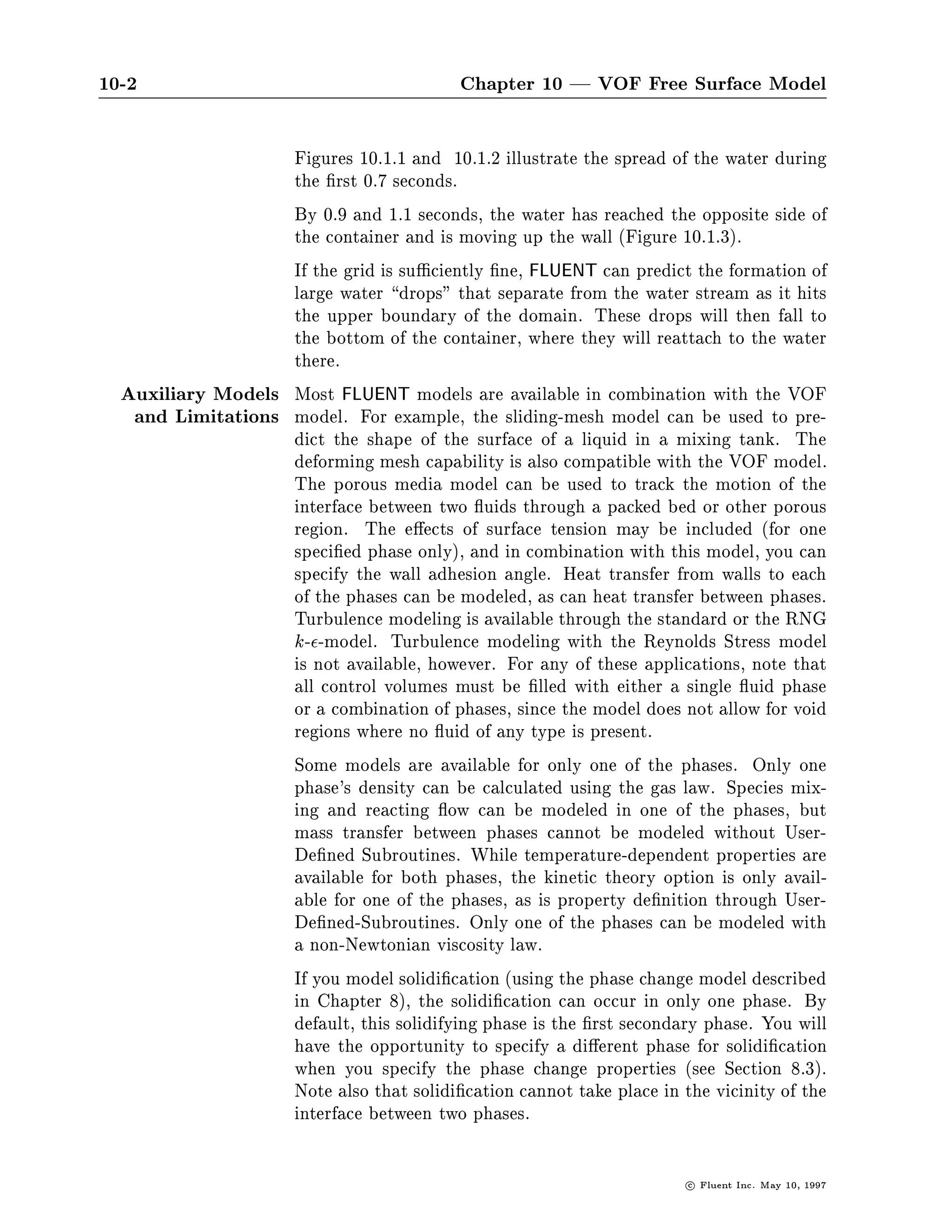 The document describes the Volume of Fluid (VOF) model for simulating flows with interfaces between multiple immiscible fluids. The VOF model tracks the volume fraction of each fluid throughout the domain using a single set of momentum equations shared between the fluids. It is designed for fluids where the interface is of interest, such as large bubbles, dam breaks, or liquid-gas interfaces. The document provides examples of simulating a dam break using the VOF model and discusses the model's steady state and time dependent capabilities as well as auxiliary models that can be used with it.