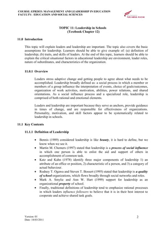This document contains course notes for the course "Management and Leadership in Education". Topic 11 discusses leadership in schools. It defines leadership and identifies key traits and skills of effective leaders, such as self-confidence, integrity, and conceptual skills. The notes explain different theories of leadership, including transformational leadership and the path-goal theory. Transformational leaders inspire followers through idealized influence, intellectual stimulation, and individualized consideration. The document also distinguishes between the roles of an administrator and a leader, noting that leaders emphasize adaptive change while administrators focus on stability and efficiency.
