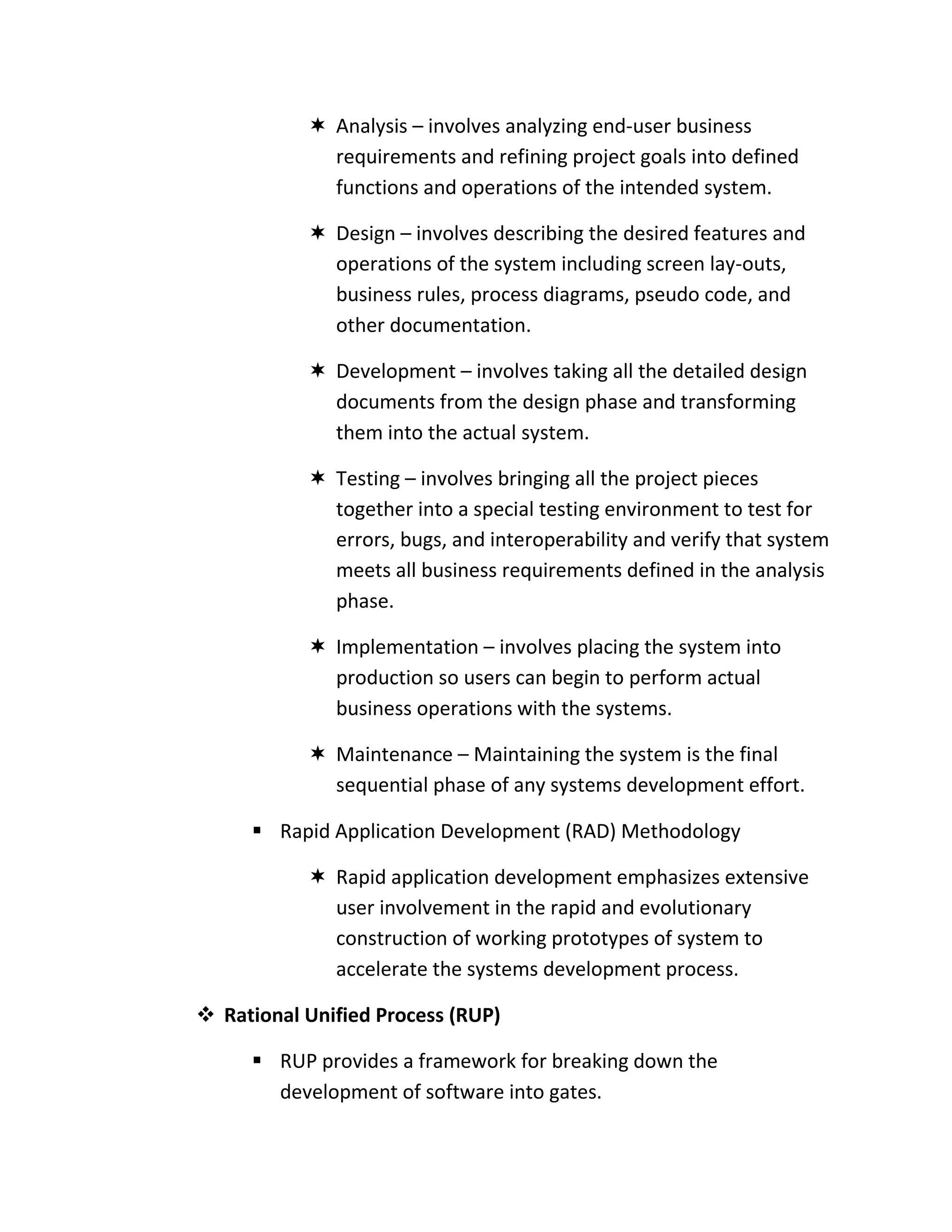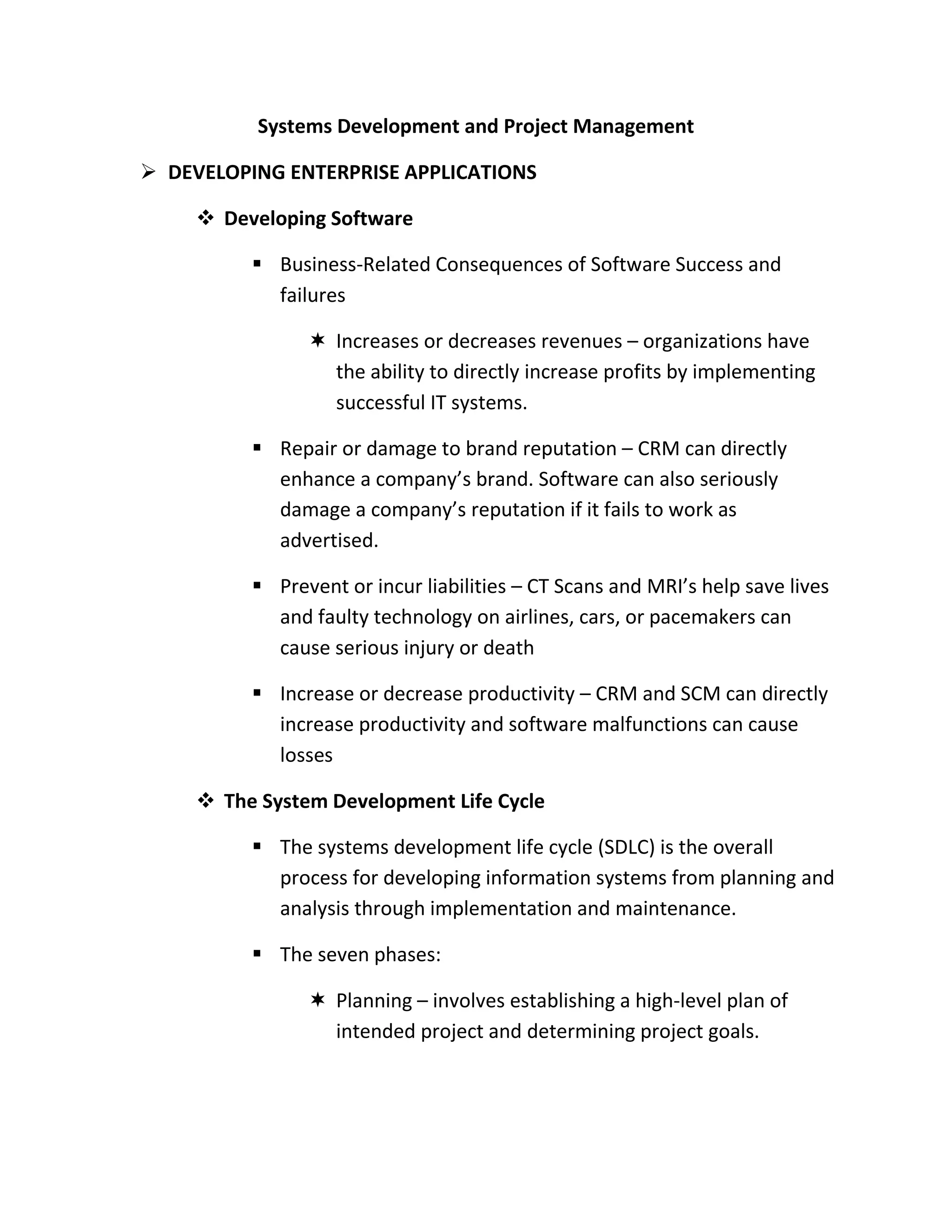 The document discusses systems development and project management. It describes the system development life cycle which includes planning, analysis, design, development, testing, implementation, and maintenance phases. It also discusses the Rational Unified Process framework and developing successful software through techniques like minimizing requirements and frequent testing. For project management, it outlines key concepts like project deliverables, milestones, and charters. It also discusses outsourcing projects and the benefits and challenges of outsourcing.