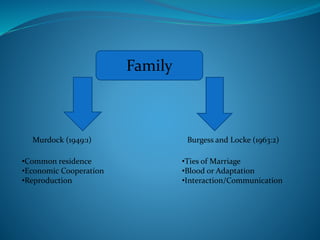 This document discusses different aspects of the family including definitions, structures, functions, and characteristics of Filipino families. It provides definitions of family from Murdock and Burgess and Locke focusing on common residence, economic cooperation, reproduction, ties of marriage, blood, and interaction. It outlines different forms of marriage including monogamy, polygamy, and types of partner selection. Family structures are organized based on internal membership, descent, residence, and authority. Specific types of families are defined like nuclear, extended, conjugal, consanguineal, patrilineal, matrilocal, and more. Functions of the family include regulating behavior, reproduction, socializing children, and providing economic function. Characteristics of Fil