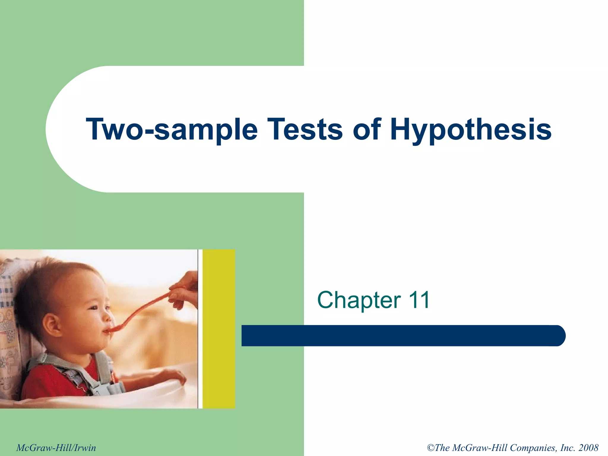 The document discusses different types of two-sample hypothesis tests, including tests comparing two population means of independent samples, two population proportions, and paired or dependent samples. It provides examples and step-by-step explanations of how to conduct two-sample t-tests, z-tests, and tests of proportions. Key points covered include determining the appropriate test statistic based on sample size and characteristics, stating the null and alternative hypotheses, test criteria, and decisions rules.