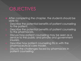 Patient counseling provides several benefits but also faces challenges. It reduces errors, noncompliance, and adverse drug reactions while improving outcomes and patient satisfaction. Counseling is integral to providing pharmaceutical care and professional pharmacy services. However, pharmacists face challenges like lack of time, incentives, and an environment conducive to counseling. Regulations, acceptance by other providers, and patient factors can also impede counseling.