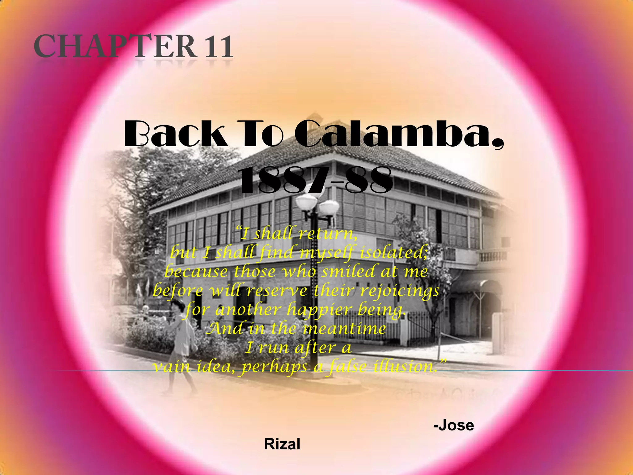 Rizal returned to the Philippines in 1887 after 5 years abroad. He practiced medicine in Calamba and operated successfully on his mother's eyes. However, his enemies who resented his book Noli Me Tangere persecuted him and threatened his life. Despite warnings not to return, Rizal was determined to serve his oppressed people and understand the impact of his writings. Upon his happy return to Calamba, he was welcomed by his family but had to be protected by his brother from enemy threats. Rizal continued practicing medicine while also facing growing political storms over the controversy caused by Noli Me Tangere.