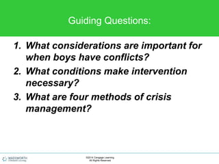 This document provides guidance for teachers on intervening in conflicts, managing strong needs behaviors, and building partnerships with families. It discusses considering boys' development when handling conflicts, intervening when safety is at risk, using crisis management techniques like redirection, taking a comprehensive approach to addressing chronic issues through relationship building and individual plans, managing personal feelings of anger, and reducing tensions with parents through respectful communication and mediation if needed.