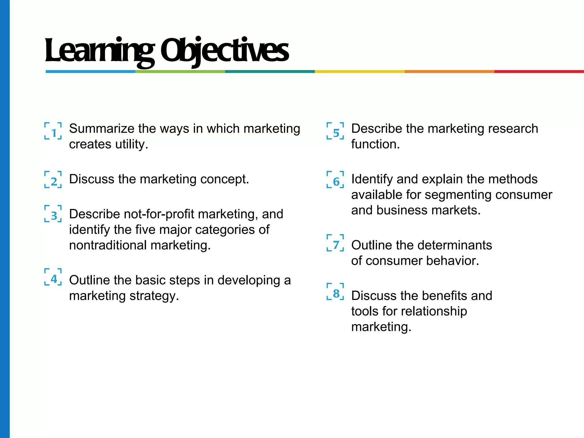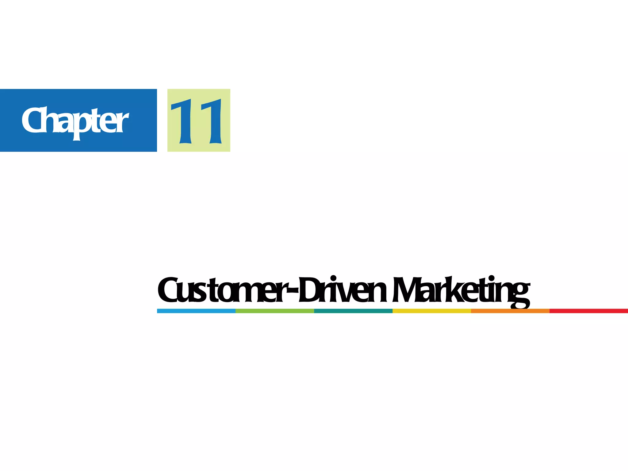 The document summarizes key concepts in customer-driven marketing. It discusses how marketing creates utility for customers and the evolution of the marketing concept to a customer orientation. It also outlines the basic steps in developing a marketing strategy, including analyzing target markets and creating a marketing mix. Relationship marketing and tools for nurturing customer relationships are also summarized.