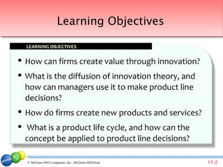This document discusses innovation and new product development. It introduces key concepts like the diffusion of innovation theory, product life cycle, and strategies for different stages. The document also outlines the new product development process from idea generation through evaluation. It describes methods like internal R&D, customer input, concept testing, and market testing that firms use to create new products and services.