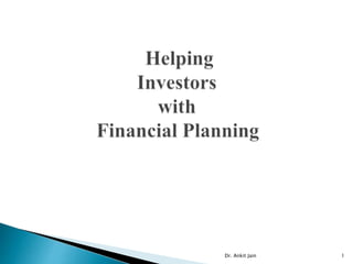 Financial planning involves creating a systematic plan to meet financial goals by ensuring the right amount of savings and investments. It includes gathering client data, analyzing their financial situation, developing recommendations, implementing the plan, and monitoring it. The plan should account for different life stages like childhood, early career when earning and saving begins, marriage when protection needs rise, parenting when education is a priority, retirement planning, and intergenerational wealth transfer.