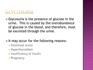 Glycosuria is the presence of glucose in the urine, caused by excess glucose in the blood that must be excreted. It can occur due to emotional stress, hyperthyroidism, insulin insufficiency, or pregnancy. More serious causes are thyroid or cortisone hormone abnormalities, growth hormone excess, or diseases like diabetes, meningitis, or peptic ulcers. Renal glycosuria is a rare form where blood glucose is normal but glucose is improperly reabsorbed by kidney tubules. Polyuria is frequent, abnormally large urination that can be caused by caffeine, alcohol, overhydration, or excess salt or glucose intake, and may indicate conditions like diabetes, polycystic kidney disease