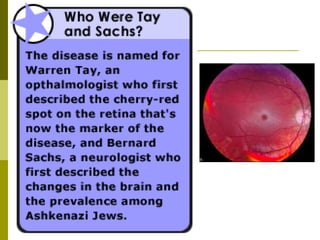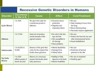 This document summarizes several human genetic disorders including their inheritance patterns, symptoms, prevalence, and treatment options. Huntington's disease is an autosomal dominant neurological disorder with onset between 30-50 years of age that is always fatal. Cystic fibrosis is the most common lethal genetic disorder among white Americans, affecting the lungs and digestive system due to thick mucus production, with current treatments improving life expectancy. Tay-Sachs disease causes neurological deterioration and death by age 5 due to fatty acid accumulation in the brain.