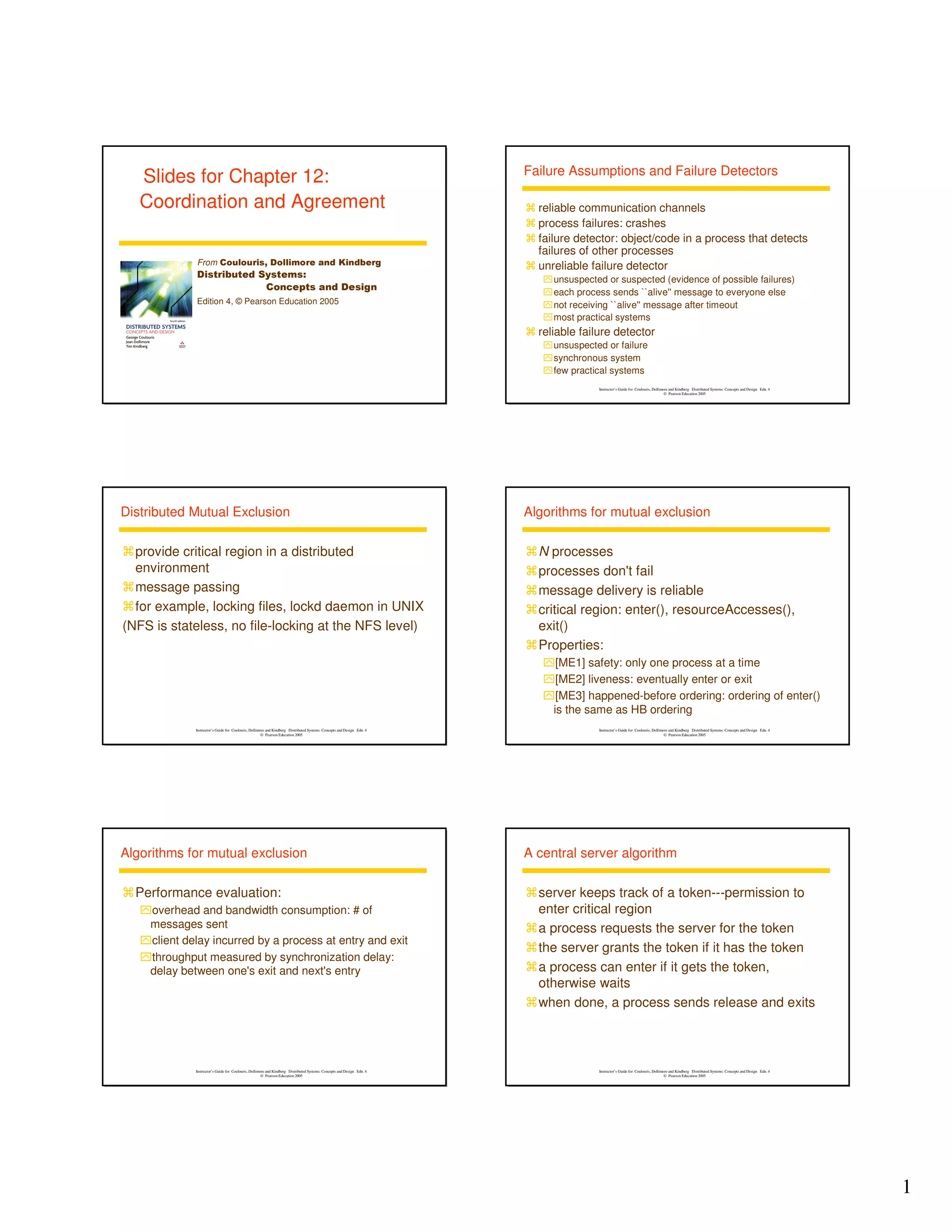 The document discusses several algorithms for distributed mutual exclusion. It begins by describing a central server algorithm where a single server process manages access to a critical region by granting a token to processes. It then covers a ring-based algorithm where a token circulates in a logical ring between processes. Finally, it summarizes Ricart-Agrawala's algorithm which uses logical clocks and multicast messages for processes to request and grant access to the critical region in a distributed manner.