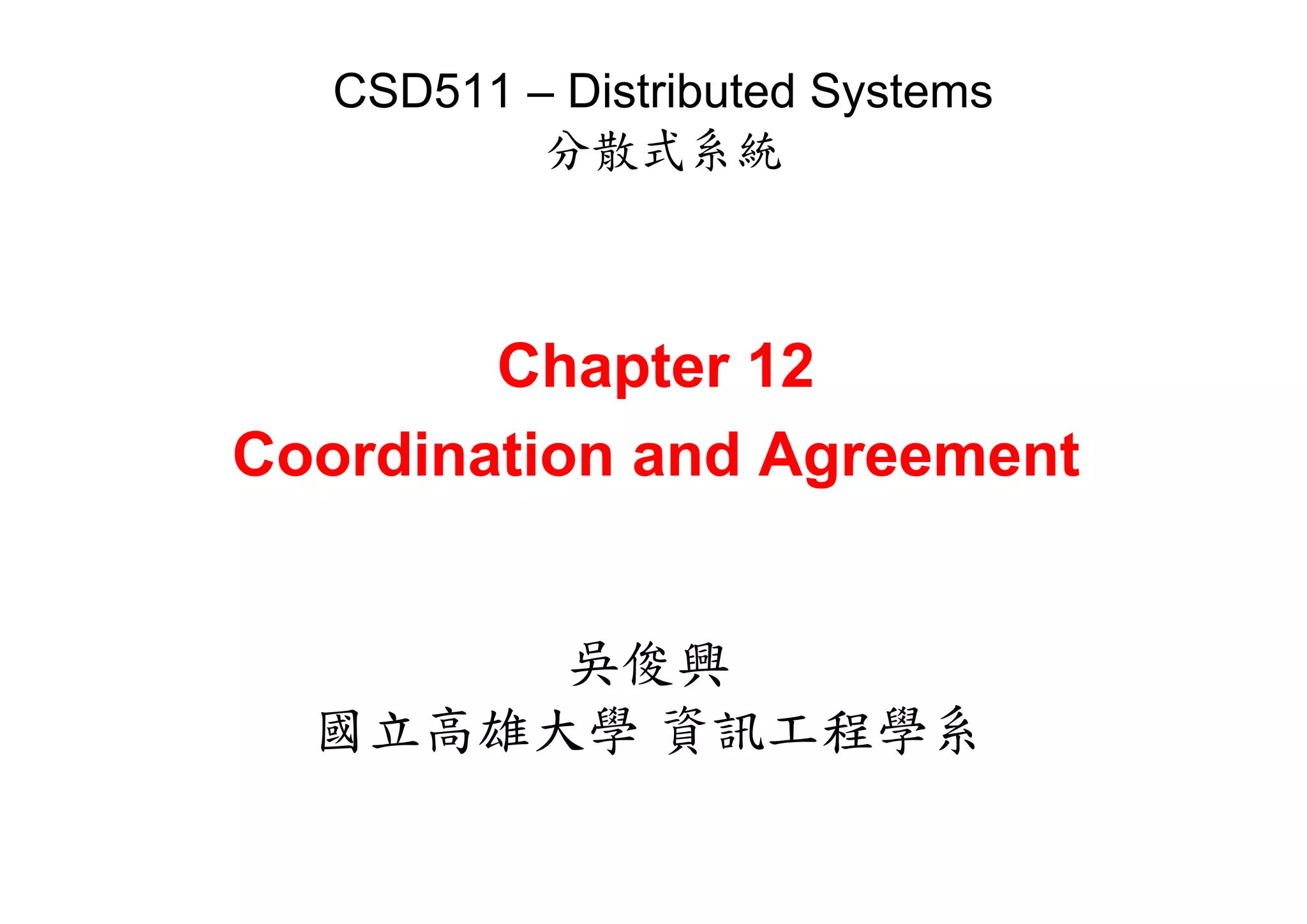 This document summarizes key concepts from Chapter 12 of the distributed systems textbook. It covers coordination and agreement problems in distributed systems, including distributed mutual exclusion, elections to choose a unique process, multicast communication, and the consensus problem. Algorithms discussed include a central server algorithm, ring-based algorithm, and algorithm using logical clocks for distributed mutual exclusion. Maekawa's voting algorithm for mutual exclusion is also summarized.