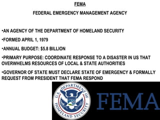 The document discusses key aspects of emergency management for sport facilities and events. It defines FEMA as the Federal Emergency Management Agency, formed in 1979 to coordinate federal response to major disasters that overwhelm local/state authorities. The four phases of emergency management are outlined as mitigation, preparedness, response, and recovery. Emergencies can range from local to major to catastrophic depending on their scope and impact. Proper training is emphasized as critical to overcoming fear and responding effectively in emergency situations.