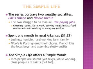Paris Hilton and Nicole Richie star in The Simple Life where they spent one month working manual jobs in rural Arkansas. Reality TV obsessively focuses on labor and work, often redefining work as competition, with Project Runway celebrating a meritocratic work ethic and The Simple Life representing an abandoned work ethic. Reality TV has no writers and produces are known to piece together contestant interviews out of context to fit a narrative.