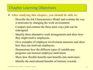The document discusses various ways to motivate employees through job design based on the Job Characteristics Model. It describes how jobs can be redesigned through methods like job rotation, enlargement, and enrichment. It also discusses alternative work arrangements like flextime and job sharing as well as telecommuting. The goal of these job design and arrangement approaches is to enhance motivation, satisfaction, and performance by varying skills, tasks, responsibilities, schedules, and work locations.