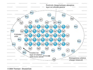This document discusses gravimetric analysis methods which involve weighing precipitates or volatile decomposition products. It describes two major types - precipitation methods where the analyte is converted to a precipitate, and volatilization methods where the analyte or its products are vaporized. Ideal precipitates are readily filtered, insoluble, stable, and of known composition. Larger particle sizes are easier to filter but particle size depends on factors like solubility, temperature and concentration. Precipitates can form by nucleation or growth, and experimental controls aim to produce crystalline rather than colloidal precipitates. Coprecipitation of impurities is also discussed.