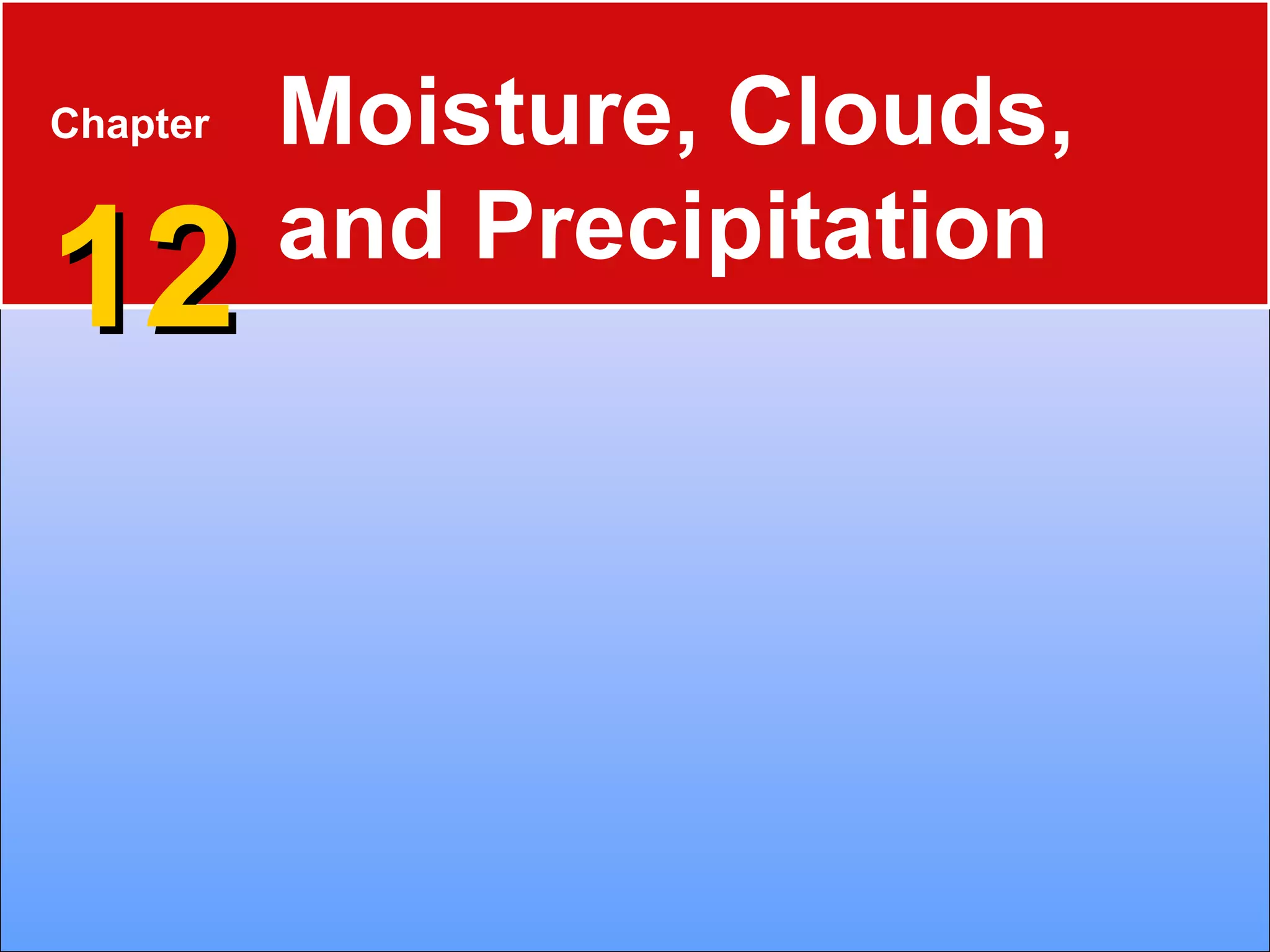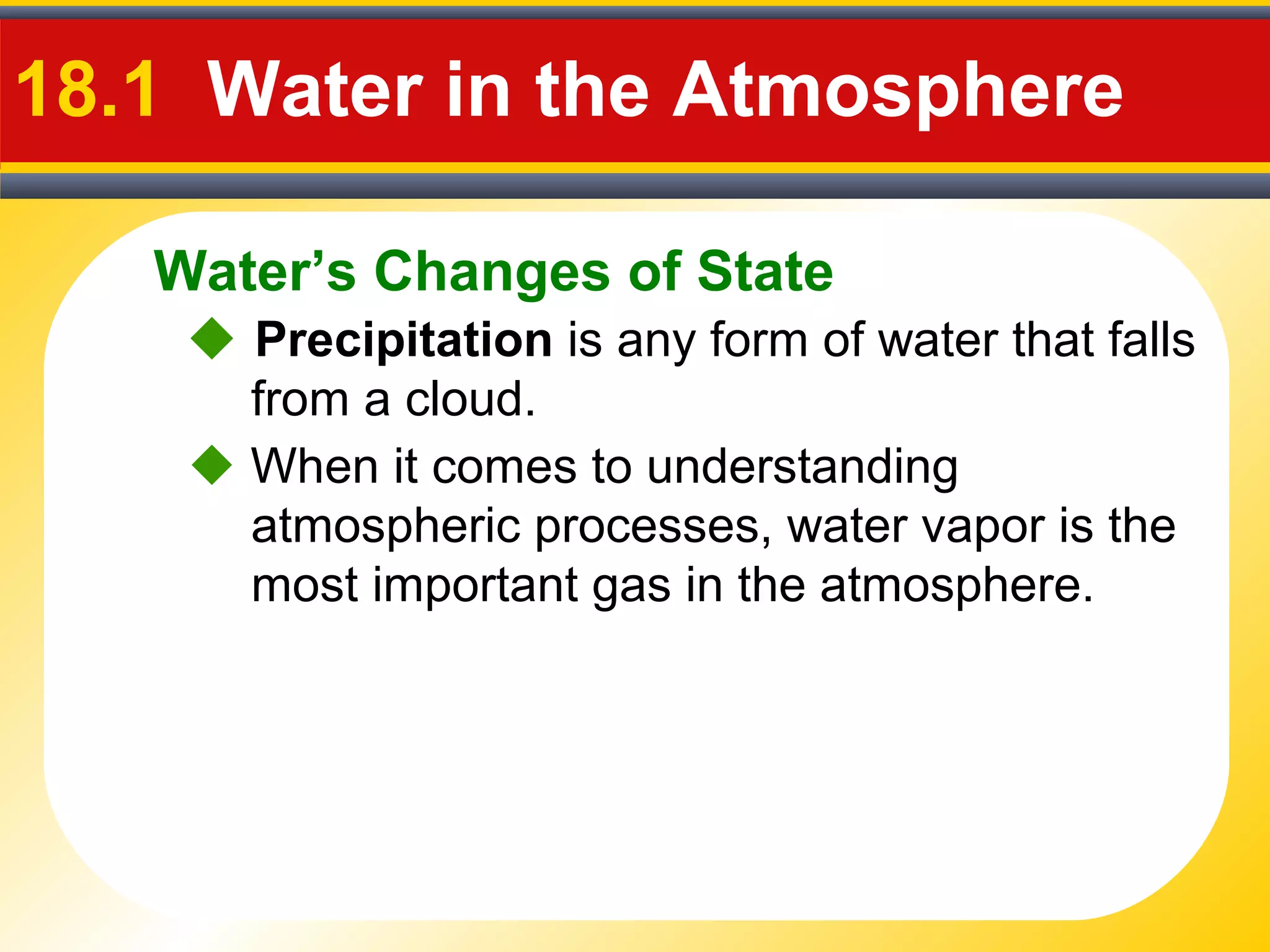 The document discusses the water cycle and atmospheric processes involving water. It describes the different states of water and the processes of changing between states, such as melting, evaporation, and condensation. It also discusses humidity, cloud formation mechanisms like lifting and cooling of air, cloud classification, how precipitation forms within clouds, and the different forms of precipitation like rain, snow, hail, and sleet.