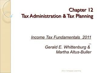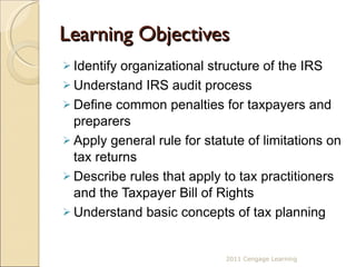The document summarizes key aspects of tax administration and planning according to US law. It describes the organizational structure of the Internal Revenue Service (IRS) and its audit processes. It also outlines taxpayer penalties, statutes of limitations, the roles of tax practitioners, and concepts of tax planning to minimize liability legally.