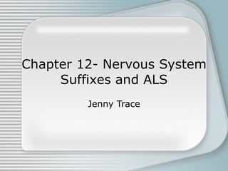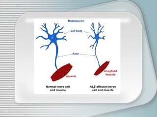 Amyotrophic lateral sclerosis (ALS), also known as Lou Gehrig's disease, is a motor neuron disease that affects nerve cells in the brain and spinal cord, causing muscle weakness. As the disease progresses, it causes the loss of function in voluntary muscles as motor neurons degenerate and die, resulting in muscle atrophy. Early symptoms may include twitching or stiffness in muscles, slurred speech, or difficulty swallowing. As the disease worsens, patients experience increasing difficulty with tasks like breathing, speaking, walking, and moving, which can lead to paralysis and eventual death usually within 3-5 years due to respiratory failure.