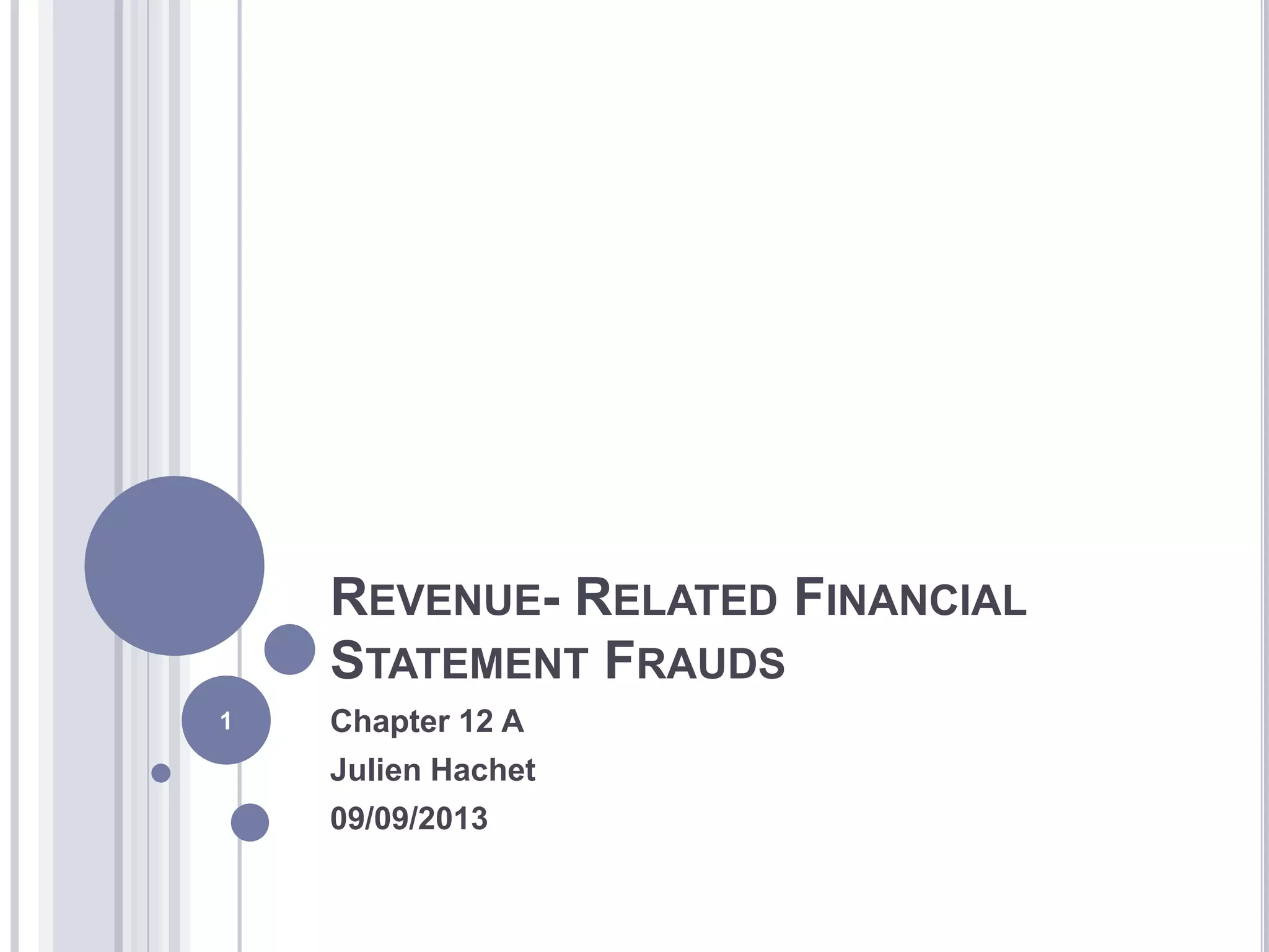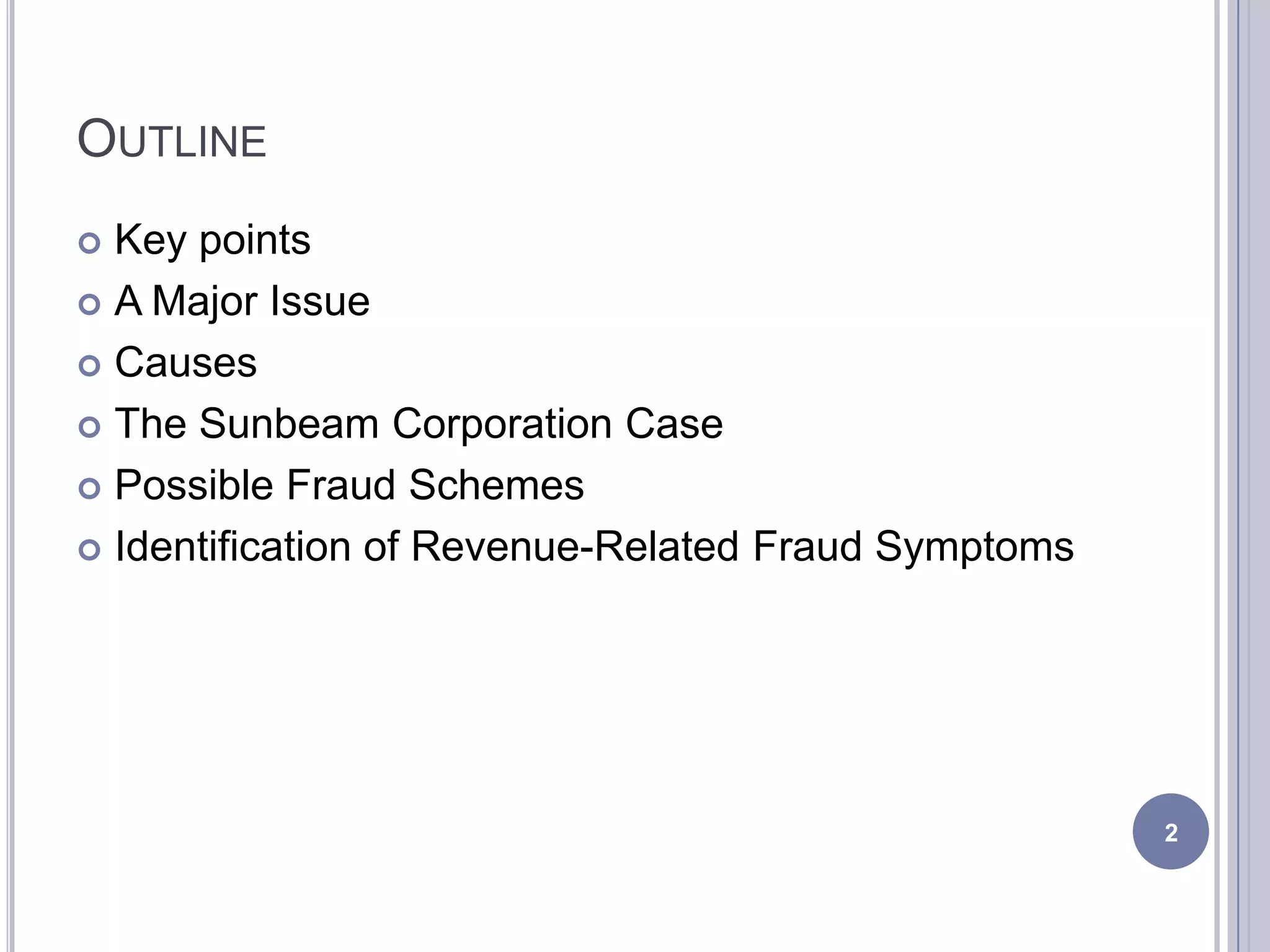 This document discusses revenue-related financial statement fraud. It begins by outlining key points and noting that over 50% of financial statement frauds involve revenue and receivables accounts. Common causes of this type of fraud include pressure to meet financial targets and easy manipulation of net income through revenues. Symptoms of revenue fraud are then categorized into six groups: analytical, documentary, control, behavioral, lifestyle, and tips/complaints. The Sunbeam Corporation case is provided as an example where a CEO created "cookie jar" reserves and overstated earnings.