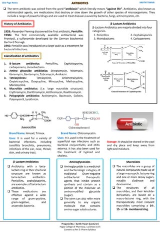 The document outlines the history, classification, and uses of antibiotics, starting from the discovery of penicillin by Alexander Fleming in 1928. It categorizes antibiotics into various classes, including beta-lactam, aminoglycoside, tetracycline, macrolide, and polypeptide antibiotics, detailing their functions and examples. Additionally, it provides information on the appropriate storage conditions for certain antibiotics.