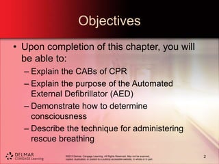 This document provides information and instructions on performing cardiopulmonary resuscitation (CPR). It begins by listing the chapter objectives, which include explaining the components and techniques of CPR for adults, children and infants. The document then discusses cardiac arrest and how CPR aims to restore circulation and breathing through chest compressions and rescue breathing. It provides detailed instructions on assessing consciousness, checking a pulse, administering chest compressions and rescue breaths. The techniques are described for both one-person and two-person CPR. It emphasizes the importance of early defibrillation using an automated external defibrillator when available.