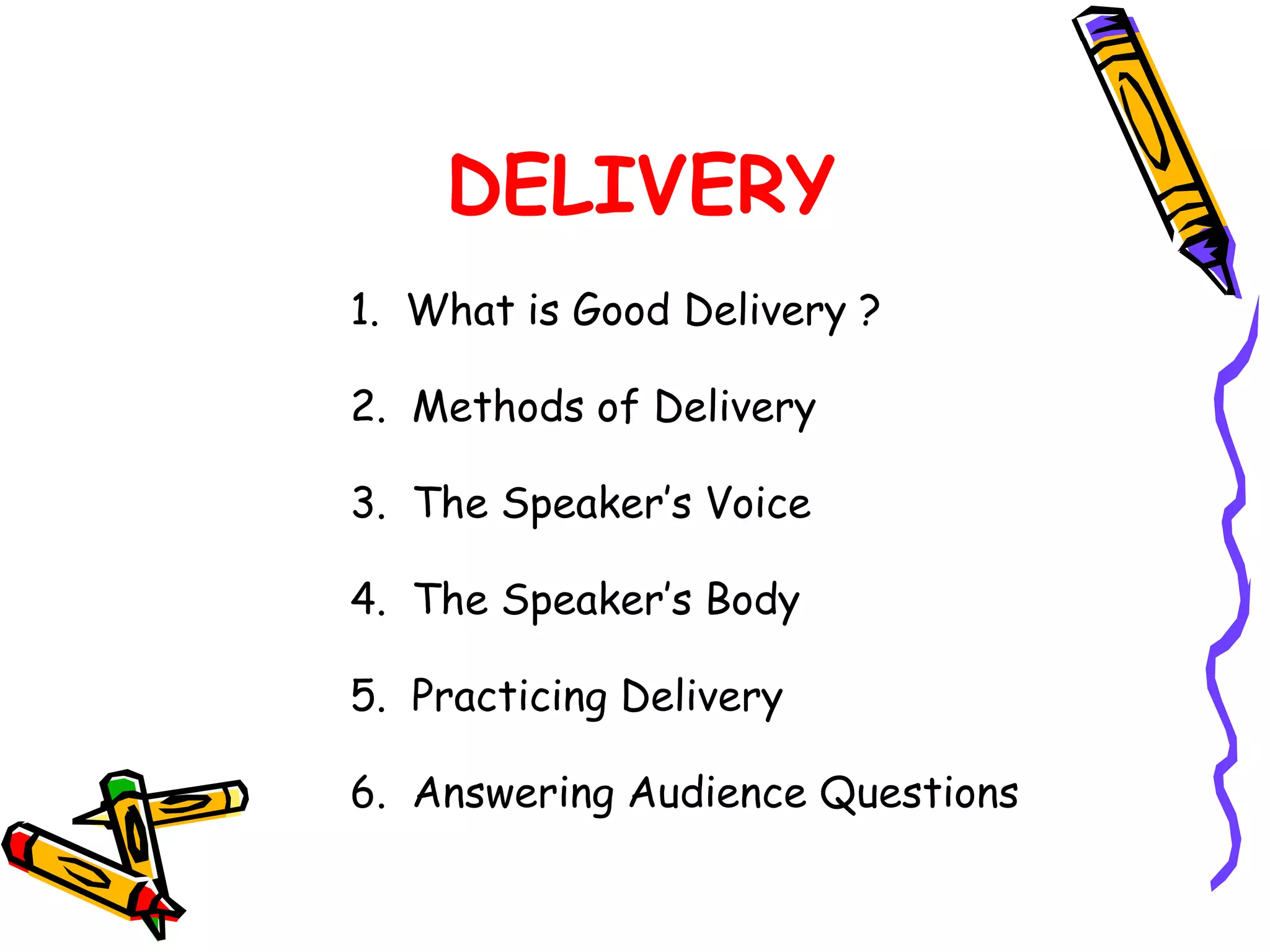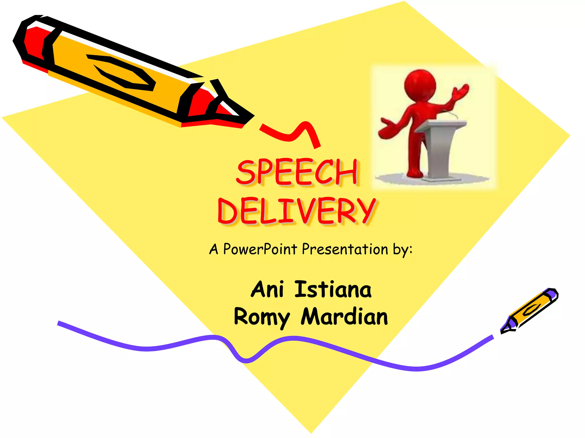 This document is a PowerPoint presentation about effective speech delivery. It discusses what constitutes good delivery, including conveying ideas clearly without being distracting. It covers various methods of delivery such as reading from a manuscript, reciting from memory, impromptu speaking, and extemporaneous speaking. The presentation also discusses elements of voice like volume, pitch, rate, and pauses. Body language aspects like eye contact, gestures and movement are addressed. It emphasizes the importance of practicing delivery through rehearsal and receiving feedback. The document concludes with tips for preparing for and managing audience question and answer sessions.