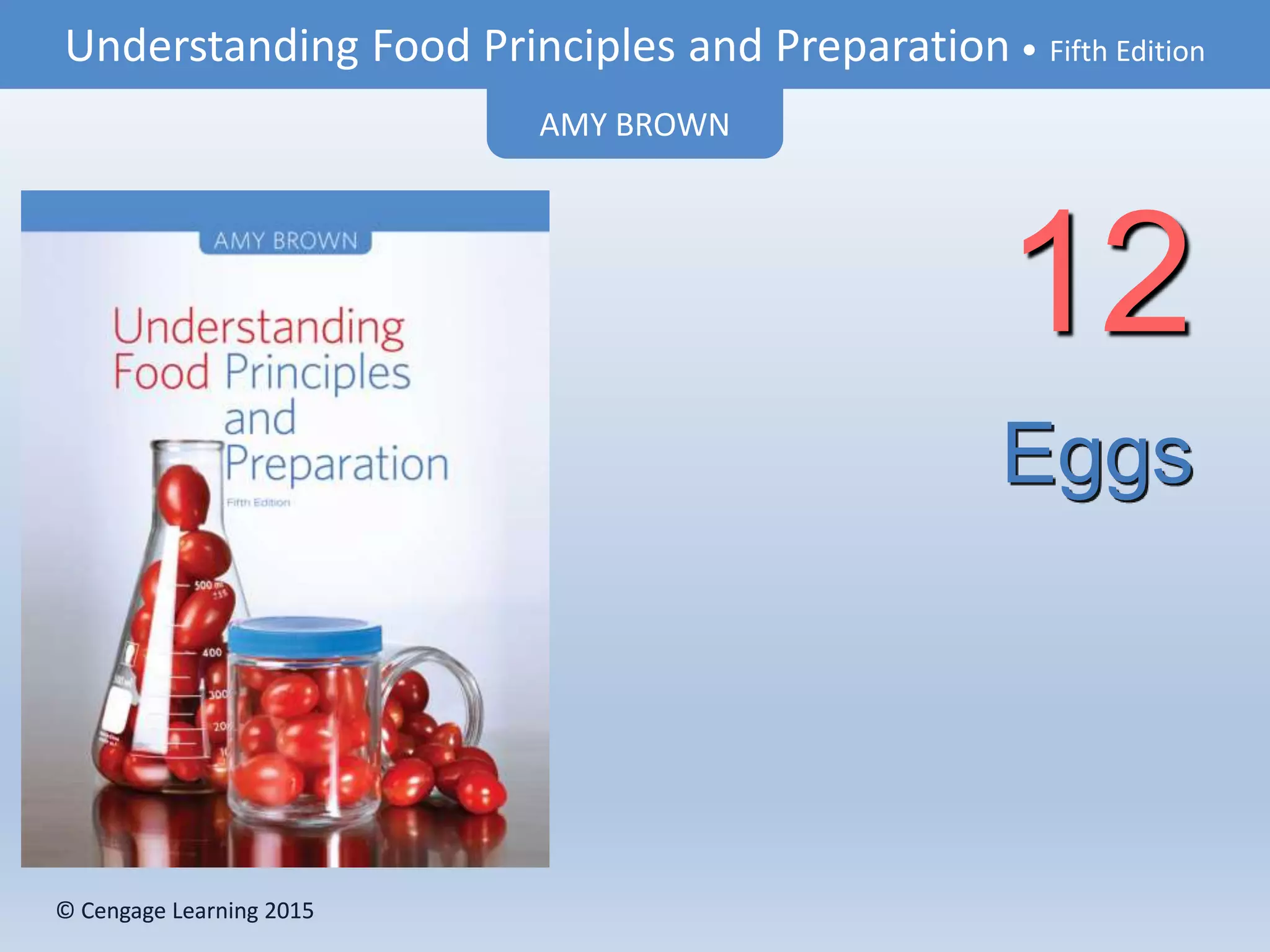 The document discusses eggs, including their composition, purchasing, types, functions in foods, preparation, and storage. It describes the main components of eggs as the yolk, albumen, and shell. It covers USDA egg grading and types of specialty eggs available. The functions of eggs in foods include emulsifying, binding, and foaming. Preparation methods include dry-heat and moist-heat cooking. Eggs should be refrigerated and cooked thoroughly for safety.
