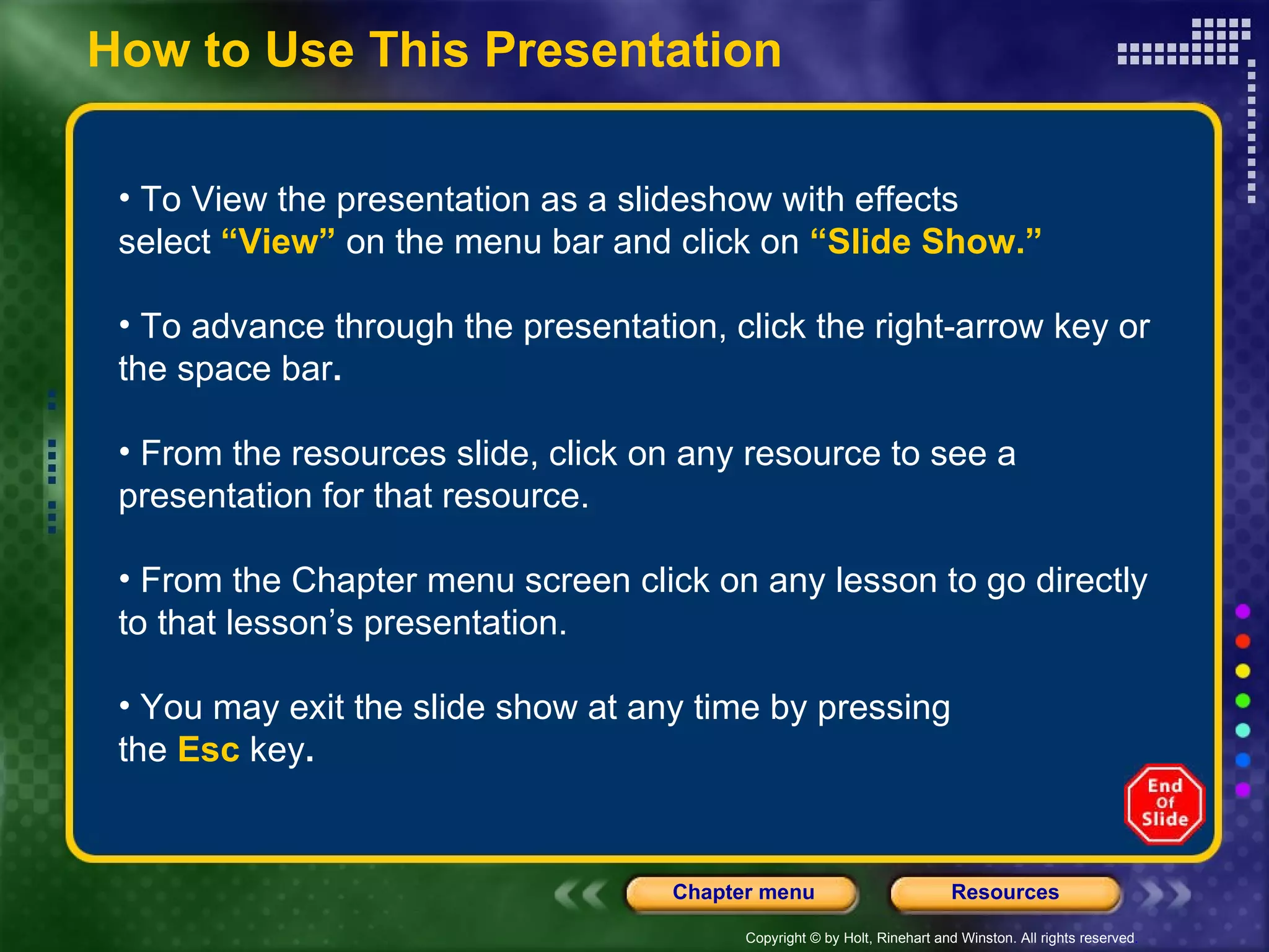 This presentation provides instructions on how to view it as a slideshow and navigate between slides. It contains sections on measuring motion, forces, and friction. Each section defines key terms, describes concepts, and includes examples and practice problems. Viewers can access the slideshow, resources, chapters, and assessments from the menu screens.