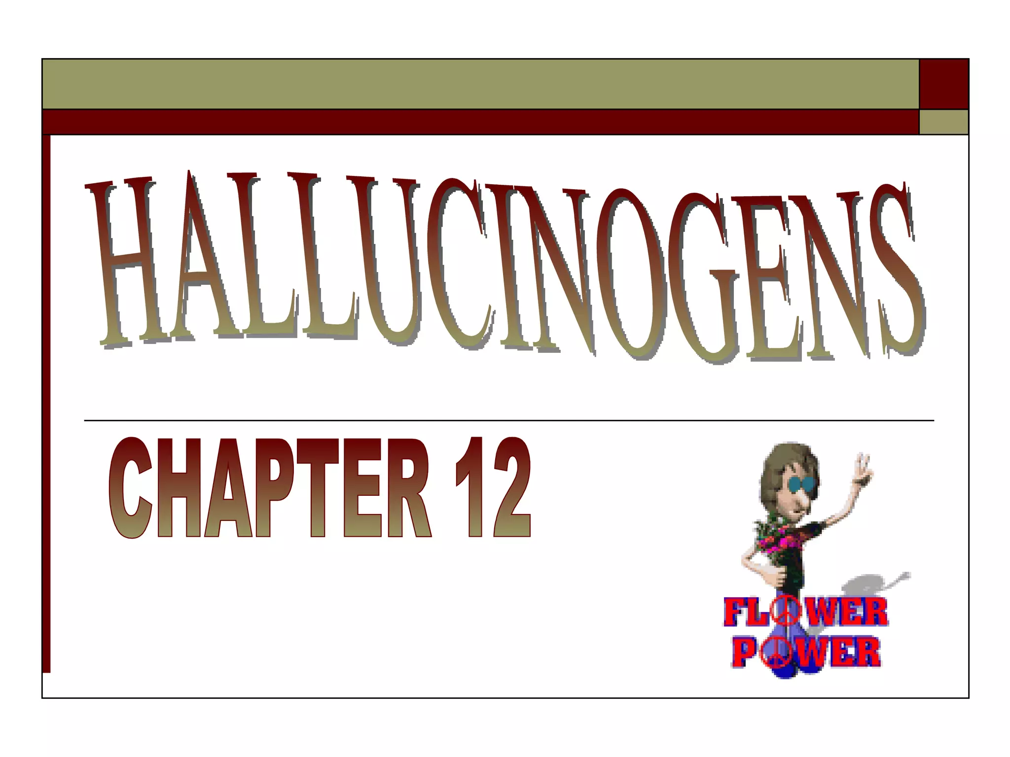 The document provides an overview of the four main classes of hallucinogenic drugs: serotonergic hallucinogens like LSD and psilocybin; methylated amphetamines like MDMA; anticholinergic hallucinogens found in plants; and dissociative anesthetics like PCP. It discusses the history of hallucinogen use from the 1960s counterculture movement to current trends, physiological and psychological effects of different classes of drugs, risks and adverse effects, and mechanisms of action in the brain.