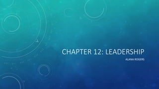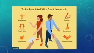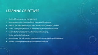 This chapter discusses theories of leadership including trait theories, behavioral theories, and contingency theories. Trait theories focus on personal qualities that differentiate leaders such as intelligence, courage, and people skills. Behavioral theories examine two leadership styles: initiating structure which focuses on tasks, and consideration which focuses on relationships. Contingency theories propose that effective leadership depends on matching a leader's style to the situation. The chapter also covers charismatic and transformational leadership, authentic leadership, the role of mentoring, and challenges to effective leadership such as complacency and over-control.