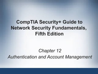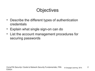 This document summarizes authentication methods and password security based on a chapter from the CompTIA Security+ Guide to Network Security Fundamentals. It describes different types of authentication credentials including what users know (passwords), have (tokens, cards, phones), are (biometrics), and do (behavioral patterns). It outlines vulnerabilities in passwords, common attacks, and defenses including complexity, hashing, and salts. Multi-factor authentication using multiple credential types provides stronger security than single-factor passwords alone.