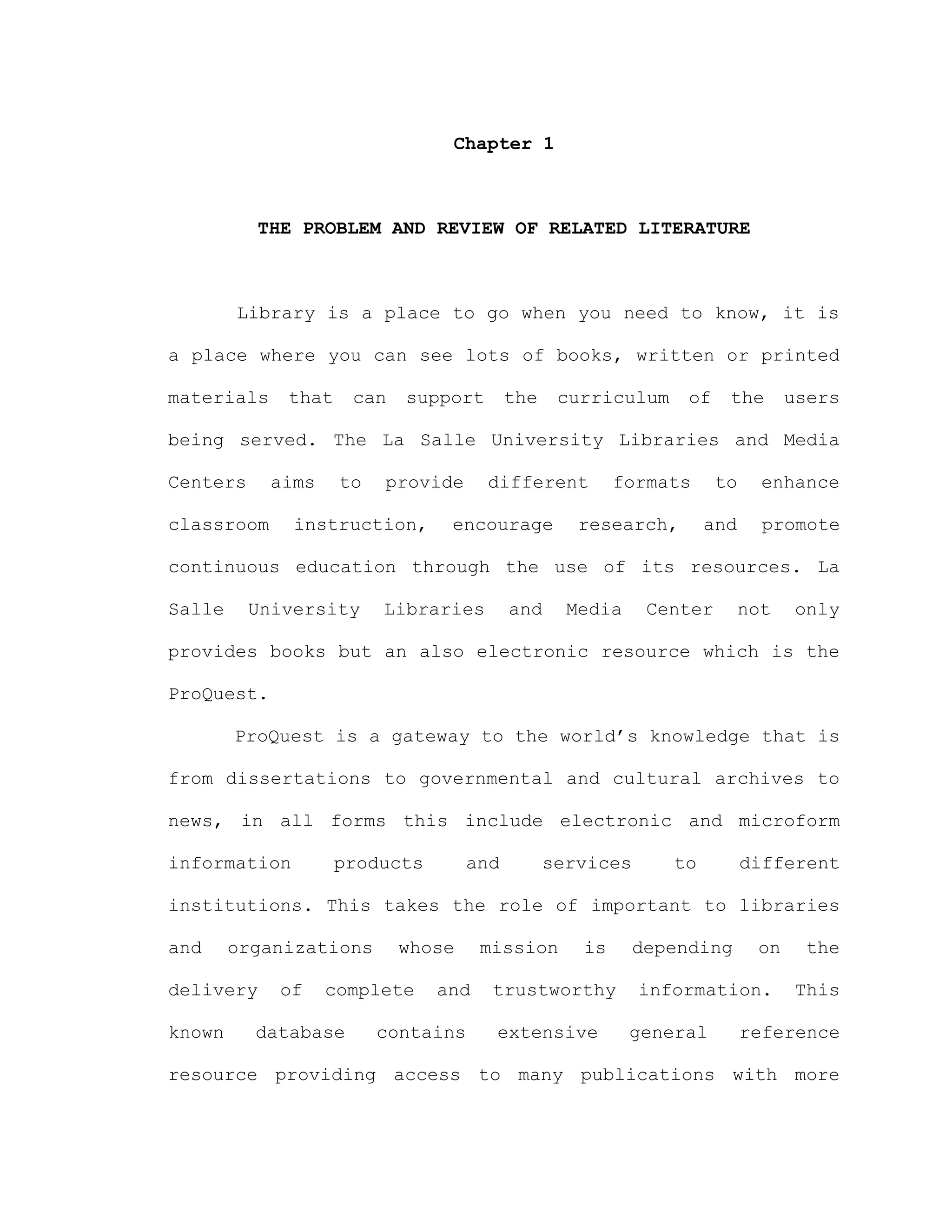 The document provides background information on ProQuest, an electronic database subscribed to by La Salle University-Ozamiz City. It discusses how ProQuest provides access to citations, full text articles, dissertations, and other materials. It also reviews literature related to e-resources, awareness of ProQuest, and barriers to its use. The study aims to determine students' use, awareness, frequency of use, reasons for using, and barriers in using ProQuest. It describes the research methodology, including the descriptive research design, setting of the study at LSU, respondents which were 505 randomly selected students, and the questionnaire used as the data collection instrument.