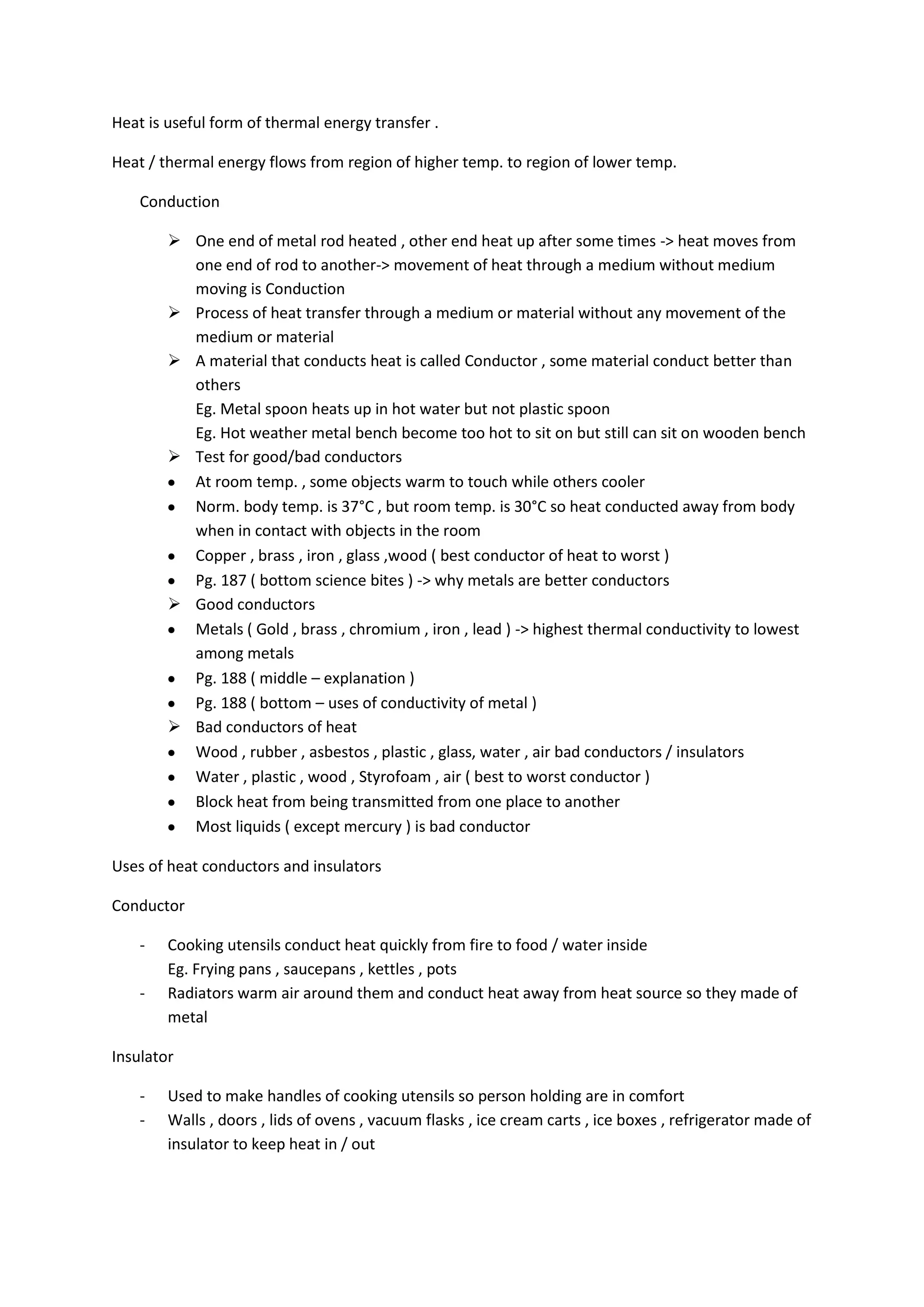 This document discusses different methods of heat transfer. It explains that heat flows from warmer to cooler regions. Conduction involves heat transfer through a medium without the medium moving. Good conductors like metals allow heat to move quickly, while insulators block heat transfer. Convection involves heat transfer through the movement of fluids like liquids and gases. Hot fluids rise and cooler fluids sink, circulating heat through the medium. Conductors and insulators have many applications based on their abilities to transfer or block heat.
