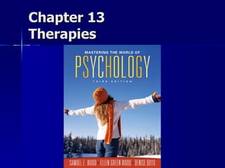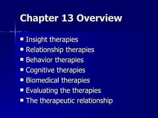 This chapter discusses various therapies used to treat psychological disorders. It covers insight therapies like psychoanalysis and psychodynamic therapies, relationship therapies like family and couple therapy, behavior therapies using principles of conditioning, cognitive therapies challenging irrational beliefs like rational emotive therapy and cognitive therapy, biomedical therapies using drugs, electroconvulsive therapy, and psychosurgery, and evaluating the effectiveness of these different therapeutic approaches.