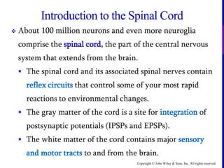 The document discusses the anatomy and organization of the spinal cord and spinal nerves. It describes the protective coverings of the spinal cord called meninges and the organization of gray matter containing neurons and white matter containing tracts within the cord. Spinal nerves emerge from the cord carrying sensory information into the cord and motor commands out. They form plexuses that branch to innervate different body regions. Injuries can cause paralysis depending on the level and severity of the injury.