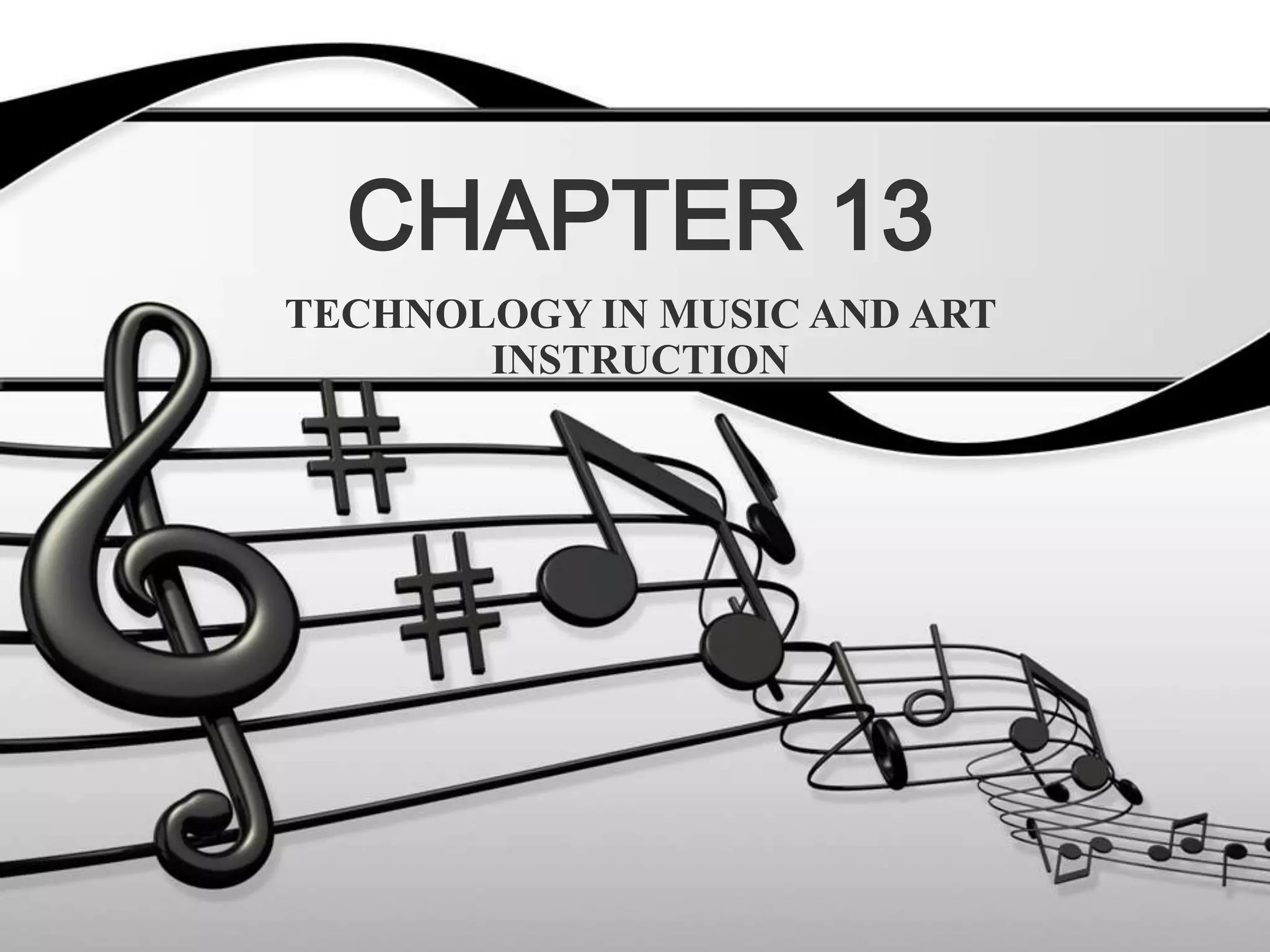 This document discusses how technology can be integrated into art and music instruction in schools. It provides reasons for linking school art programs with technology, such as expanded modes of expression and literacy for the information age. It then lists nine strategies for integrating technology into art instruction, such as accessing art examples, producing digitized images, and creating movies. For music instruction, it discusses how technology is helping more students participate by supporting composition and performance. It also lists five strategies for integrating technology into music, such as supporting music composition and allowing for self-paced learning.