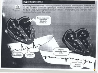 Hypermagnesemia is caused by increased magnesium intake in those with renal issues. It causes lethargy, drowsiness, impaired reflexes, and potentially respiratory and cardiac arrest. Treatment involves IV calcium and fluids. Nursing assesses for neuromuscular and cardiac issues, monitors magnesium levels and ECG, and teaches about magnesium sources.